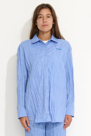 The Misfit Shapes Only Involved Crinkle Shirt in Ultramarine is an oversized LS shirt in lightweight Polyester/Cotton blend & crinkle fabric design, features a front chest satin stitched embroidery & has an open back with self fabric tie details.